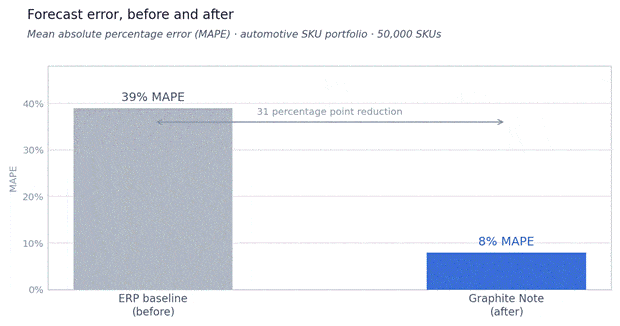 MAPE across the automotive SKU portfolio. Baseline from client’s own data warehouse vs. Graphite Note model on the same SKU set.
