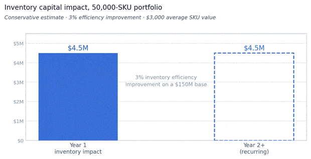 A 50,000-SKU portfolio at an average inventory value of $3,000 per SKU represents a $150M inventory base. A 3% improvement in inventory efficiency delivers $4.5M in capital impact in Year 1 alone. Even a 1% improvement produces a return that easily justifies the engagement.