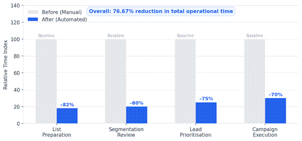 The largest gain came from replacing manual campaign logic with automated scoring and offer generation. Time previously absorbed by list preparation, segmentation review, and ad hoc prioritisation was redirected to selling. The 76.67% reduction in operational time represents compounding capacity — the same team could now work a far larger and better-qualified pipeline.