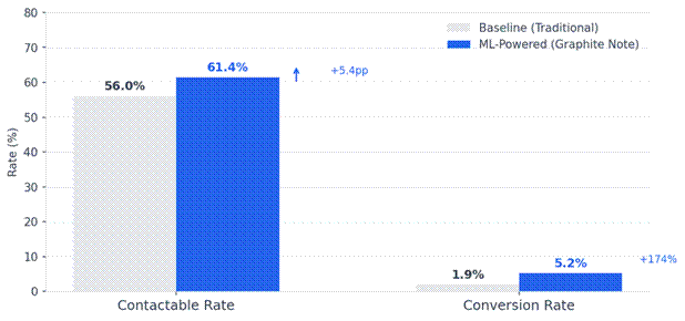 Contactable Rate and Conversion Rate — Traditional vs. ML-Powered Approach. Overall conversion rate improved by 174% on comparable outreach volume.